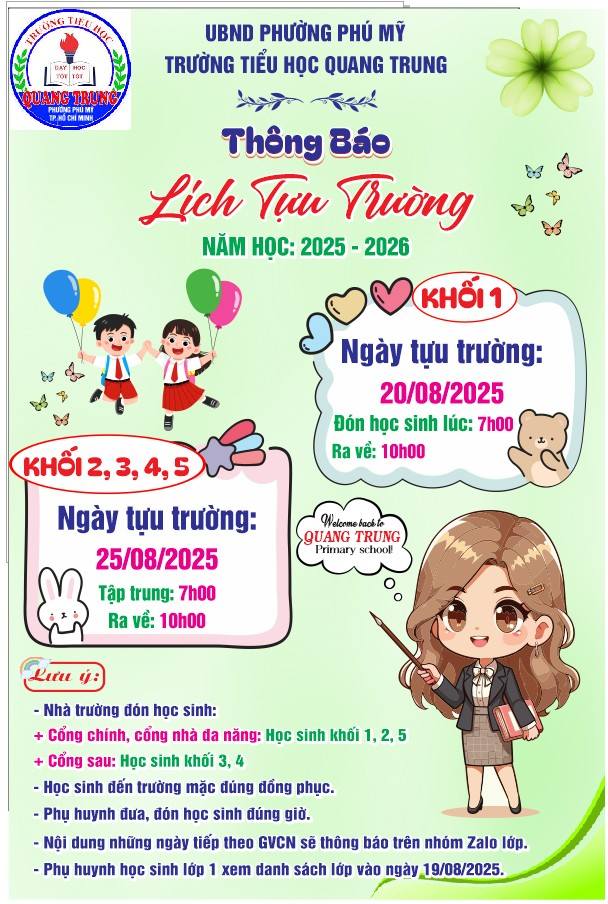 Thông báo lịch tựu trường năm học 2025 – 2026 của Trường Tiểu học Quang Trung